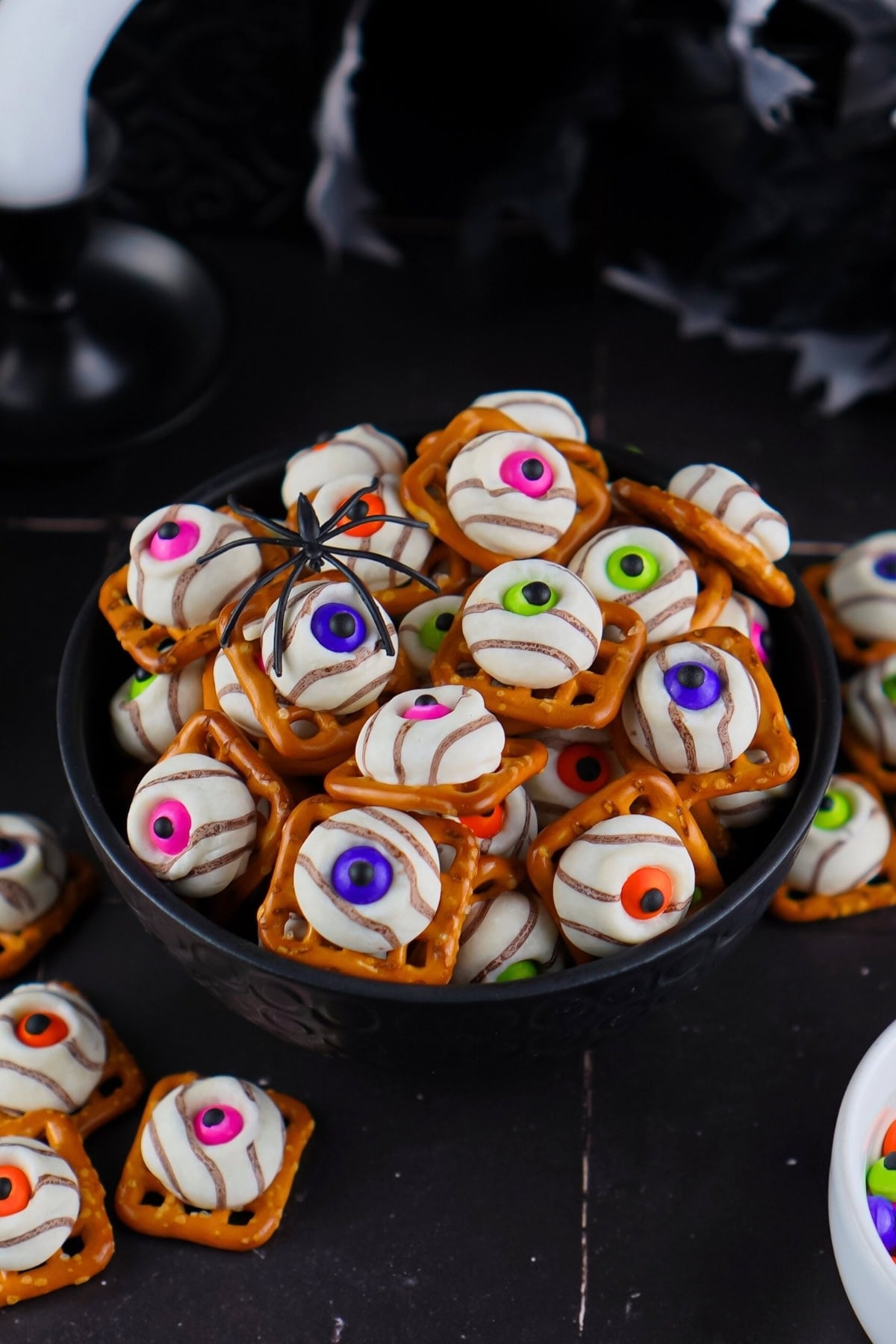 These Eyeball Pretzel Bites are perfect for Halloween party platters alongside other spooky treats. Arrange them on a black platter with other Halloween snacks for a creepy dessert table.