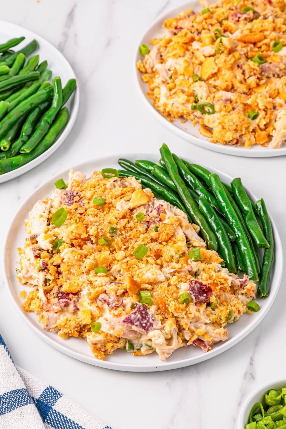 - Bake for 25-30 minutes until the casserole is bubbling around the edges and the top of the crackers has turned golden brown. Let it rest for 5 minutes before serving, then garnish with fresh parsley and enjoy this comfort food with your family.¾ cup sliced green onions