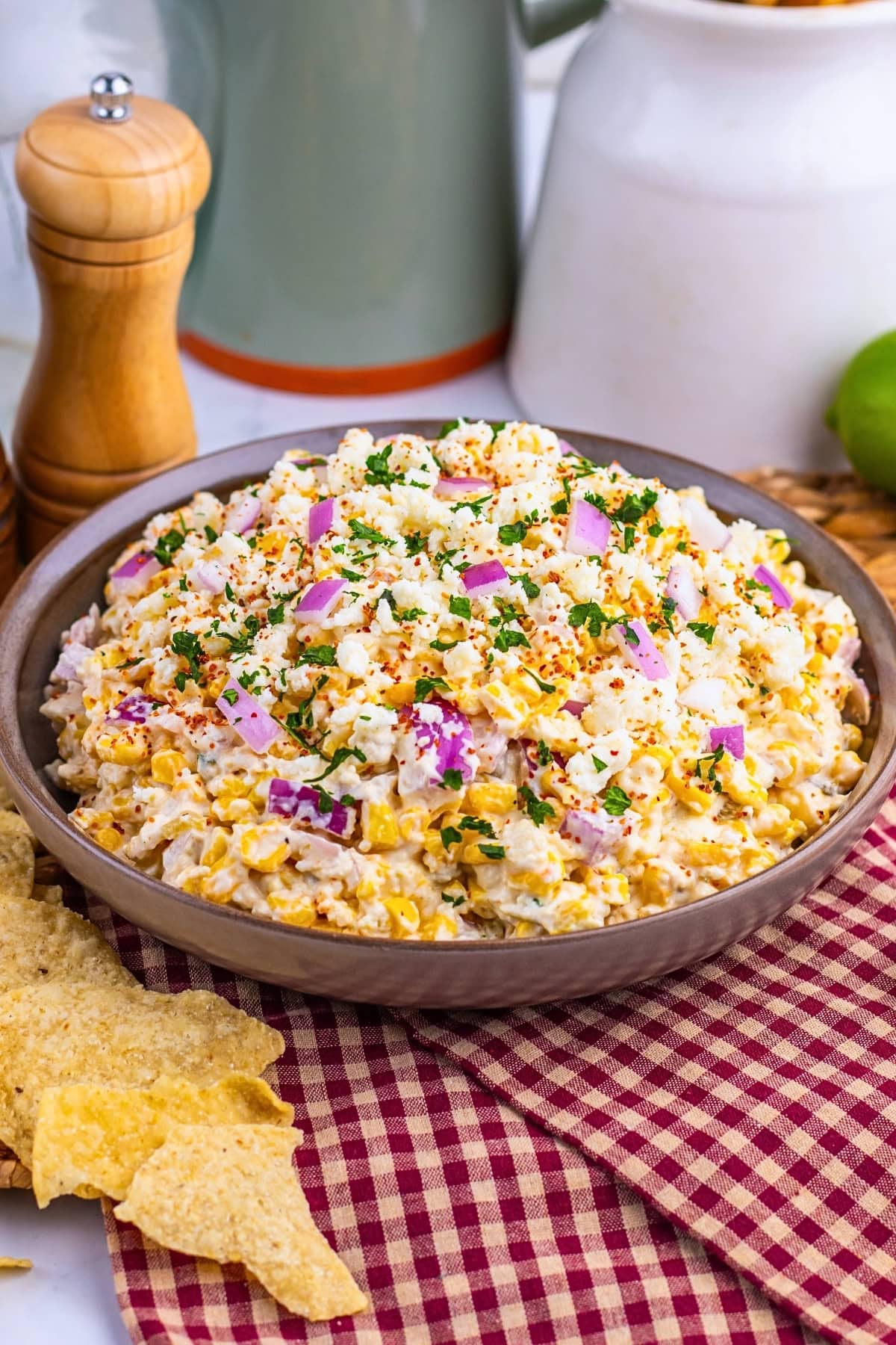 With just 5 minutes of prep time before the slow cooker takes over, Mexican street corn dip recipe is a winning warm dip that’s perfect with tortilla chips. It has cream cheese, sour cream, pepper jack and green chilies with plenty of corn throughout. Lime, Tajin and queso fresco bring those familiar street corn flavors and this is one party dip nobody can resist.