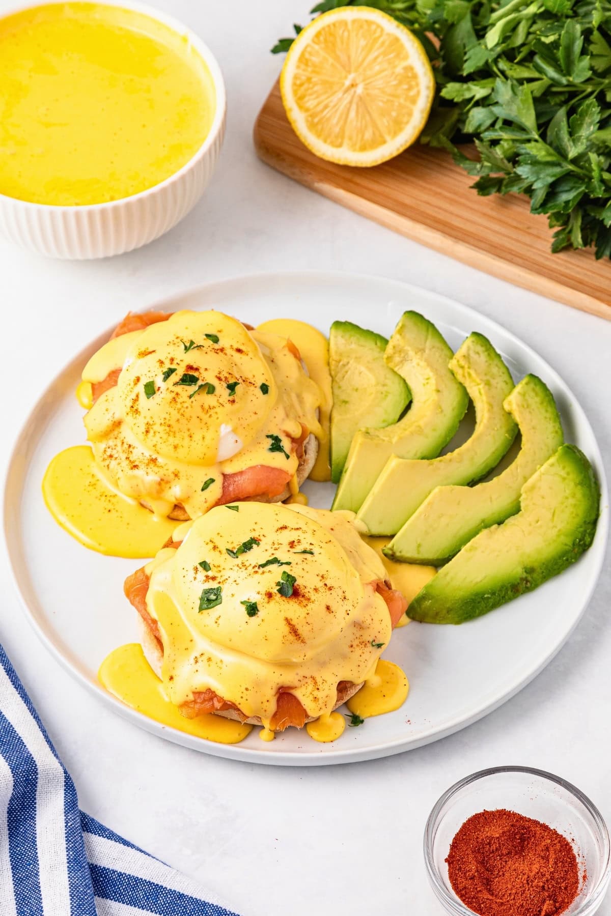 - Pour hollandaise sauce generously over each egg and serve with sliced avocado on the side.Sliced avocados