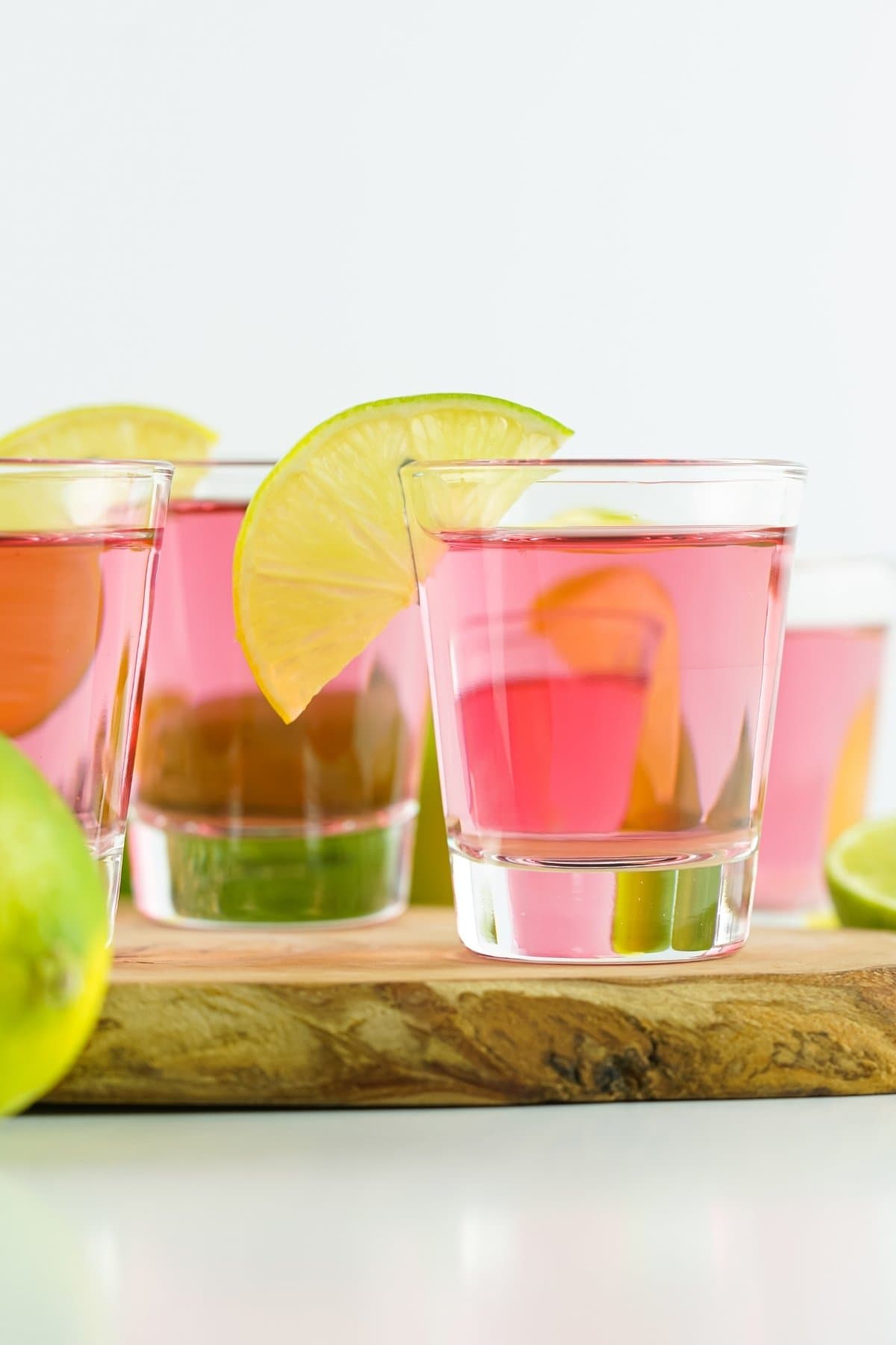 - Strain into shot glasses or a chilled martini glass.Lime Wedges